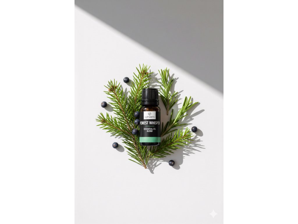 Lumante Esenciální olej Forest Whisper 10 ml vás přenese do tichého jehličnatého lesa. Spojuje svěží a pryskyřičné tóny borovice a smrku s lehce kořenitým charakterem jalovce, které doplňuje jemný citrusový akcent bergamotu.