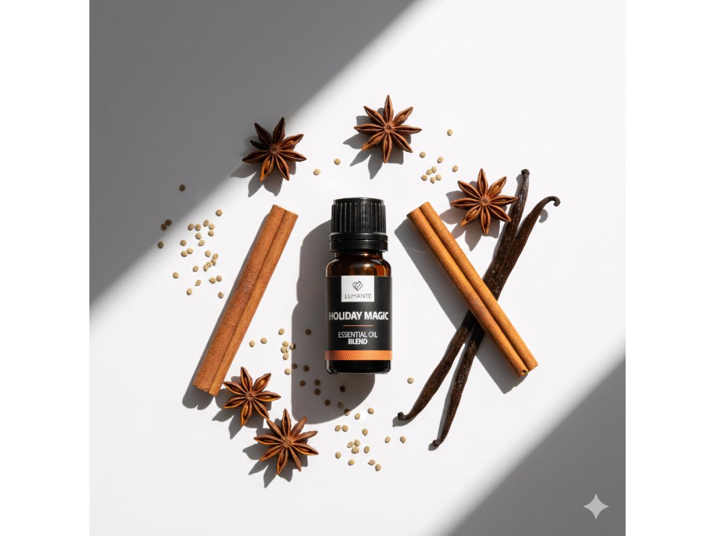 Lumante Esenciální olej Holiday Magic 10 ml je teplá a kořeněná směs s anýzem, skořicí, badyánem a vanilkou. Vytváří slavnostní, útulnou a hřejivou atmosféru ideální pro zimní měsíce nebo sváteční chvíle. Vhodný do difuzéru, aromalampy i do masážních směsí (používá se zředěný).