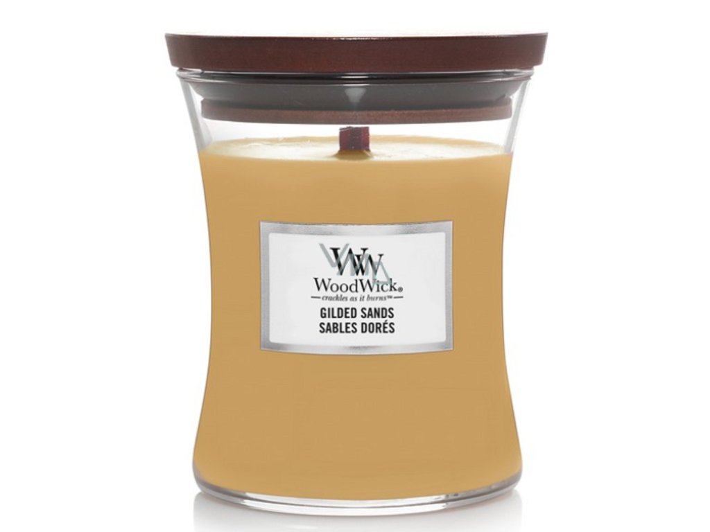WoodWick Gilded Sands je luxusní vonná svíčka ve středním skleněném obalu ve tvaru přesýpacích hodin. Svíčka obsahuje unikátní dřevěný knot, který při hoření vytváří uklidňující praskavý zvuk připomínající hořící krb.