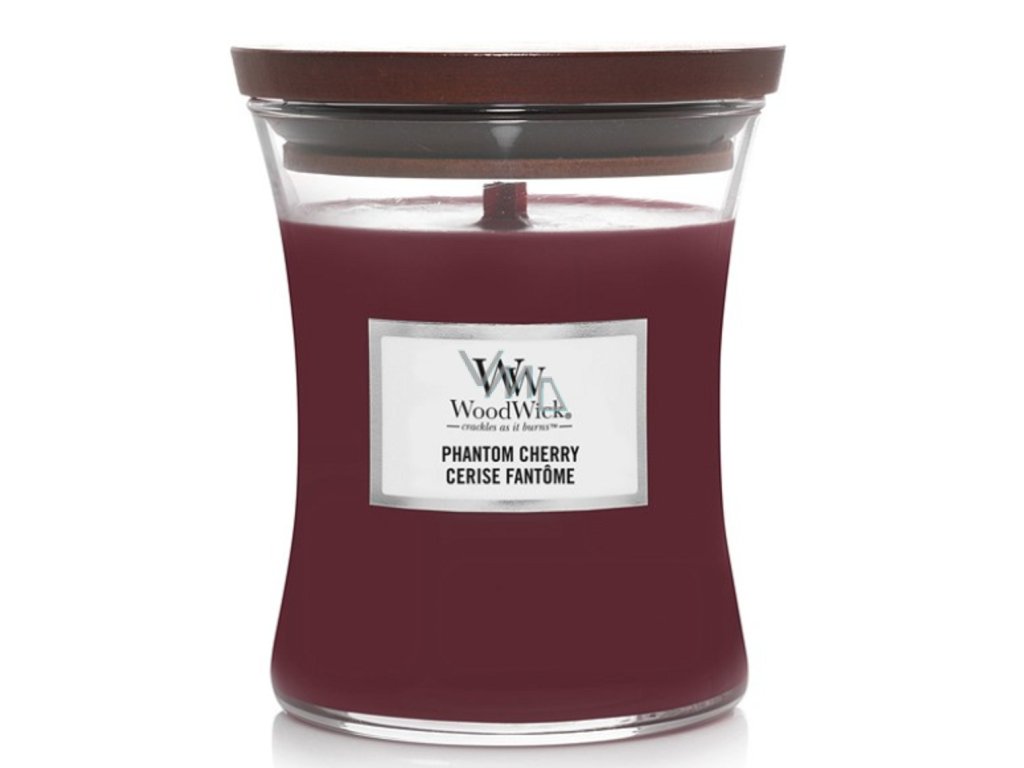WoodWick Phantom Cherry je luxusní vonná svíčka ve středním skleněném obalu ve tvaru přesýpacích hodin. Svíčka obsahuje patentovaný dřevěný knot, který při hoření vytváří uklidňující praskavý zvuk připomínající hořící krb.