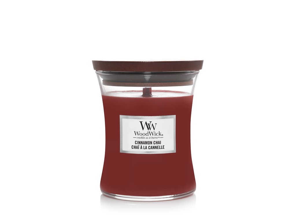 WoodWick Cinnamon Chai je luxusní vonná svíčka ve středním skleněném obalu ve tvaru přesýpacích hodin. Svíčka obsahuje unikátní dřevěný knot, který při hoření vytváří uklidňující praskavý zvuk připomínající hořící krb.