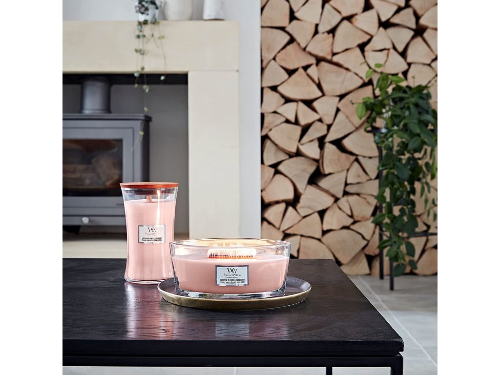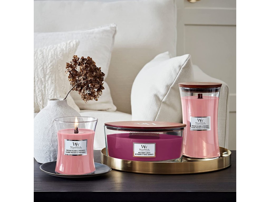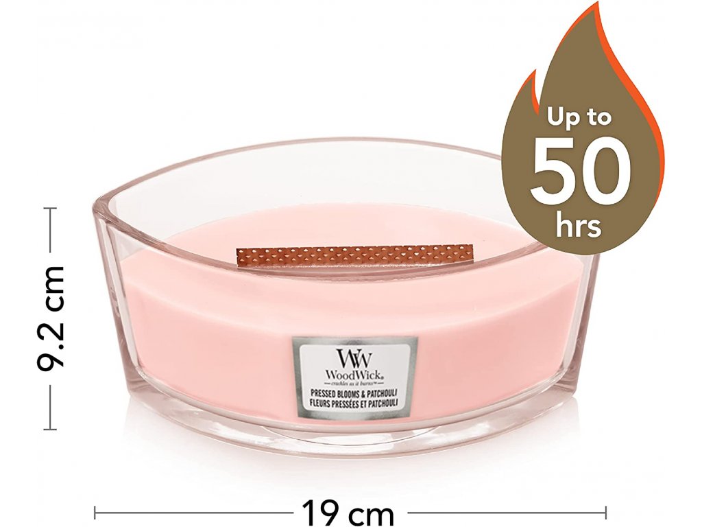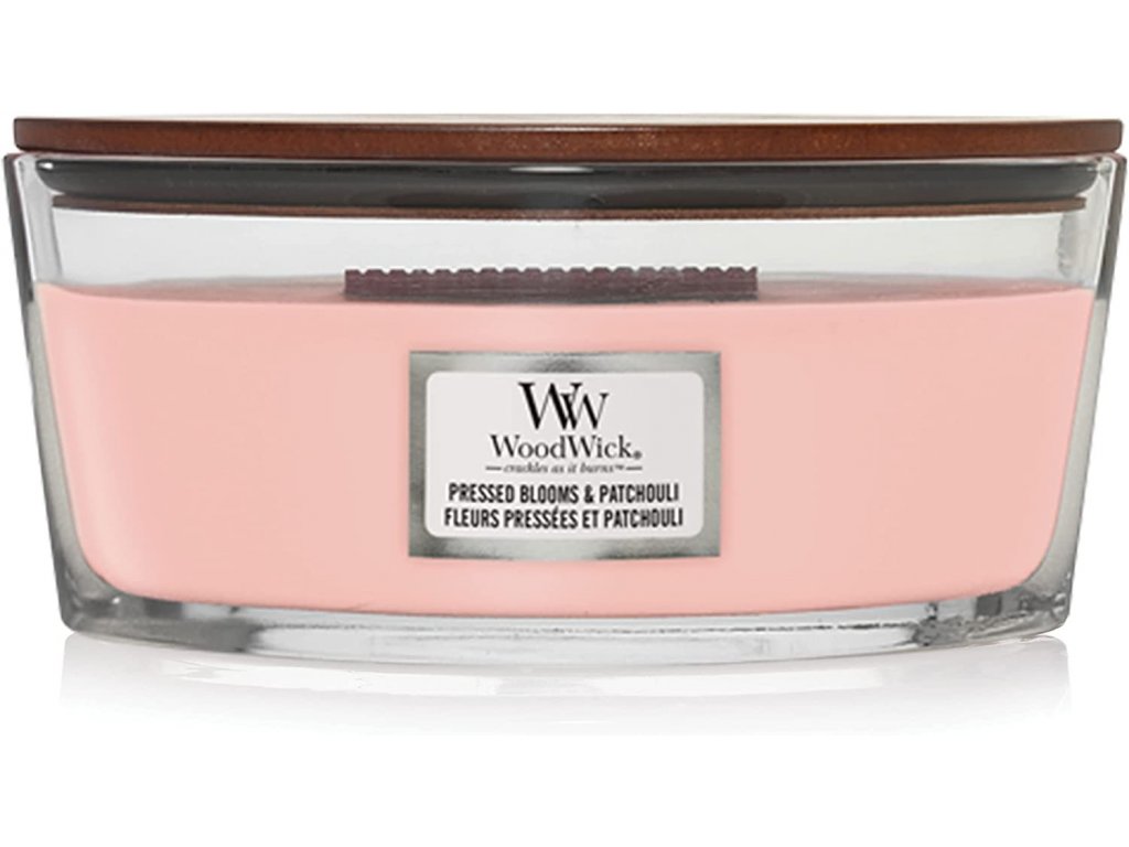 WoodWick vonná svíčka s dřevěným knotem Elipsa Pressed Blooms & Patchouli 453,6 g