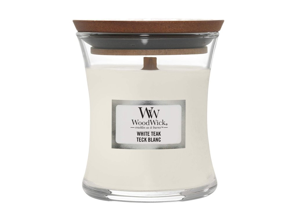 WoodWick vonná svíčka s dřevěným knotem malá White Teak 85 g
