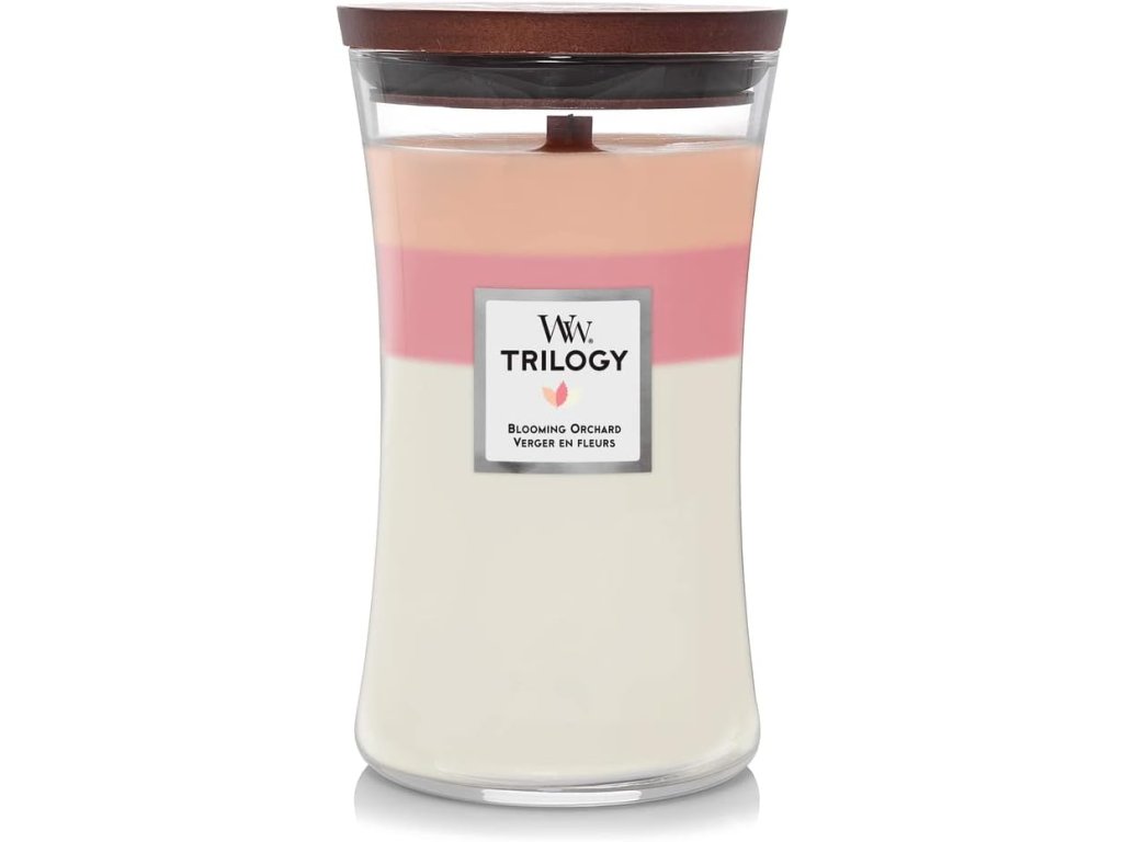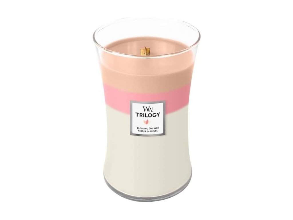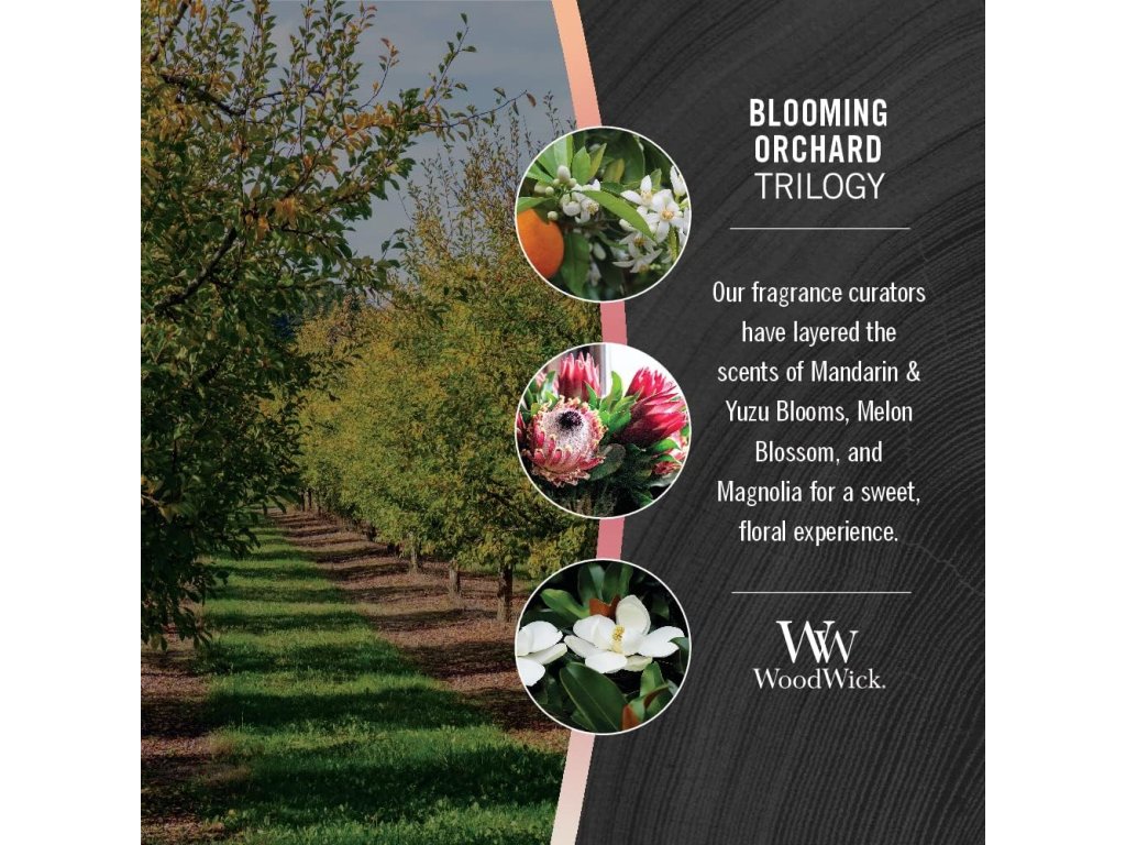 Kvetoucí sad. Svíčka WoodWick Blooming Orchard přináší unikátní vonný zážitek s třemi sladěnými vrstvami vůní: Yuzu Blooms, Melon & Pink Quartz a Magnolia. Ideální pro vytvoření harmonické atmosféry.
