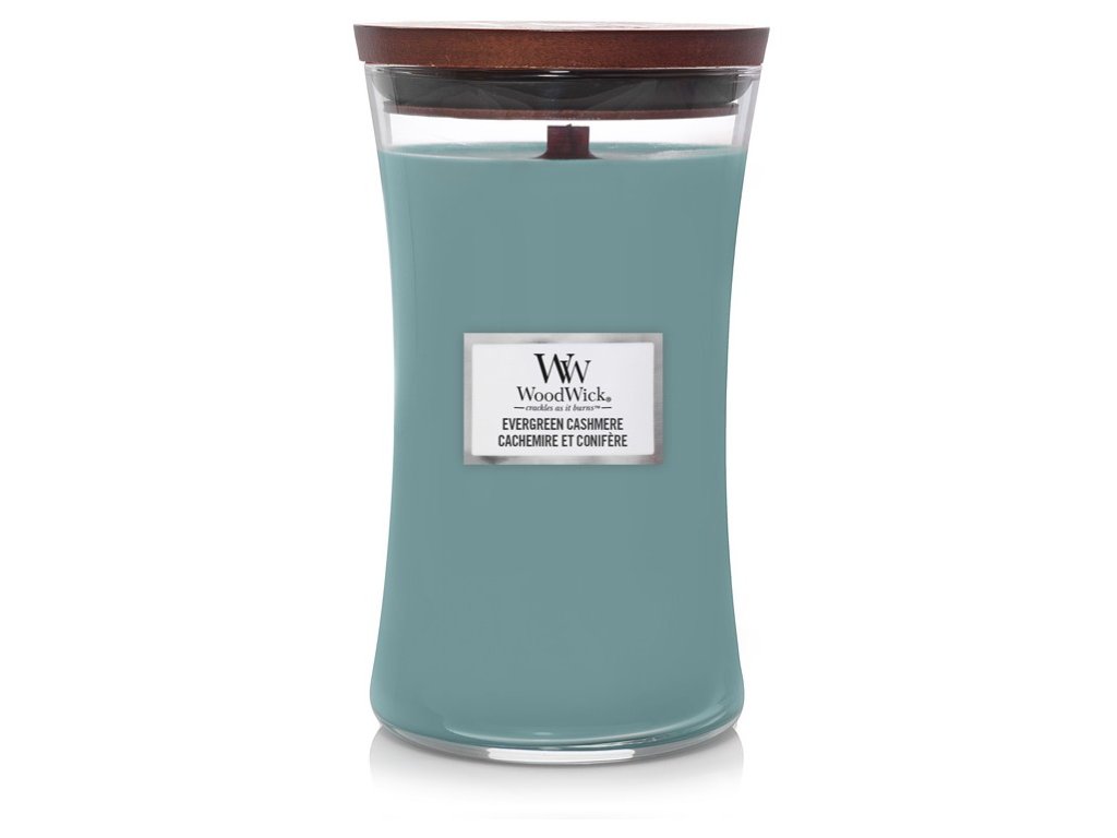 WoodWick vonná svíčka s dřevěným knotem velká Evergreen Cashmere 609 g