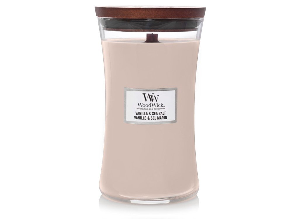 WoodWick vonná svíčka s dřevěným knotem velká Vanilla & Sea Salt přináší do vašeho domova jemnou a sofistikovanou vůni vanilky kombinovanou s čerstvým mořským vzduchem. Dřevěný knot Pluswick® zajišťuje nejen rovnoměrné hoření, ale také příjemné praskání, které navozuje útulnou atmosféru. Skleněná nádoba a dřevěné víčko dodávají svíčce elegantní vzhled a doba hoření až 130 hodin zaručuje dlouhotrvající vonný zážitek.