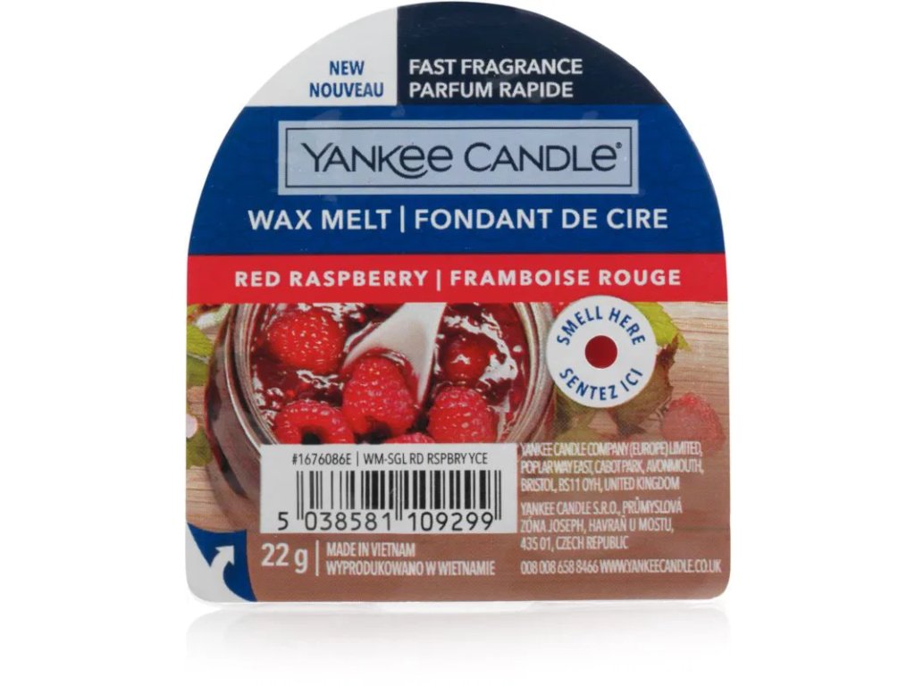 Vonný vosk Yankee Candle Red Raspberry, 22 g: šťavnatá a sladká vůně zralých malin s jemnými ovocnými tóny. Ideální pro milovníky svěžích a ovocných vůní.
