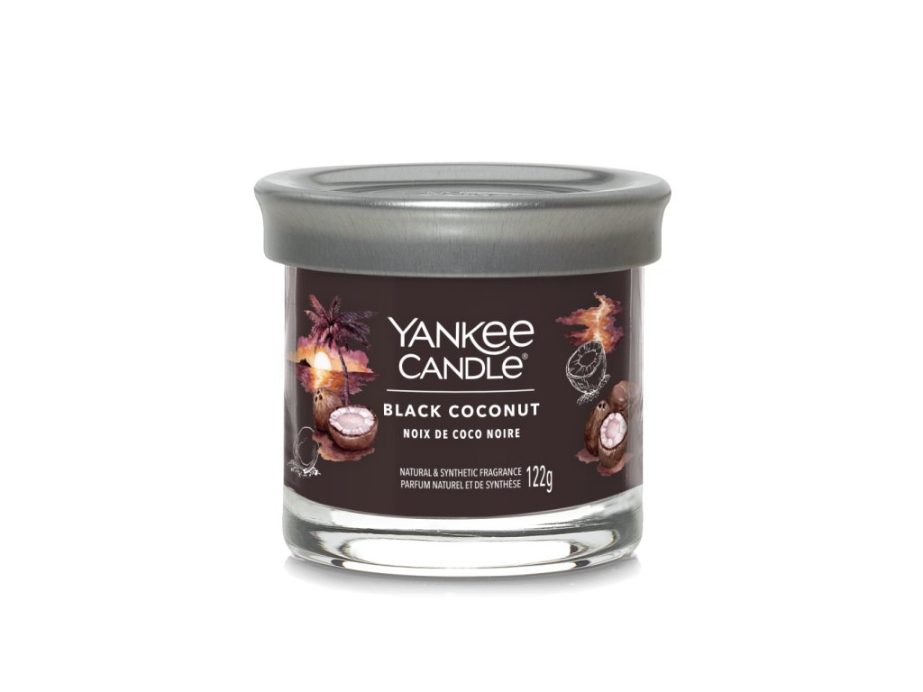 Yankee Candle Signature 122 g – Black Coconut: exotická vůně kokosového ořechu, cedrového dřeva a ostrovního pižma. Tmavá, smyslná kompozice pro relaxaci i večerní atmosféru.