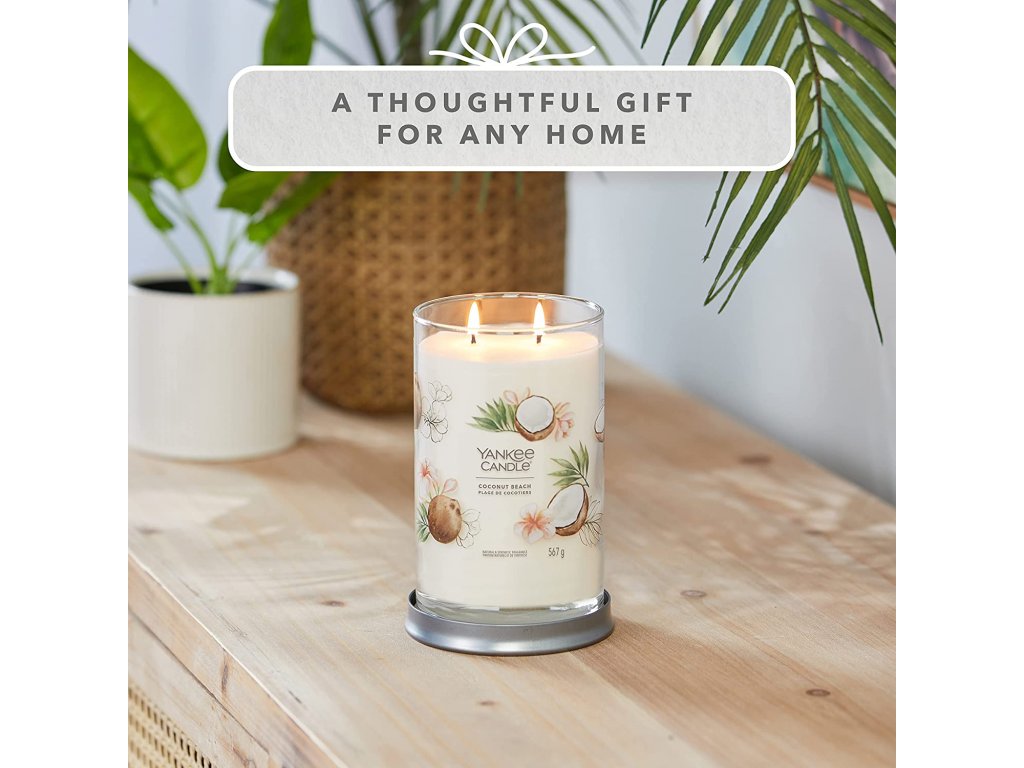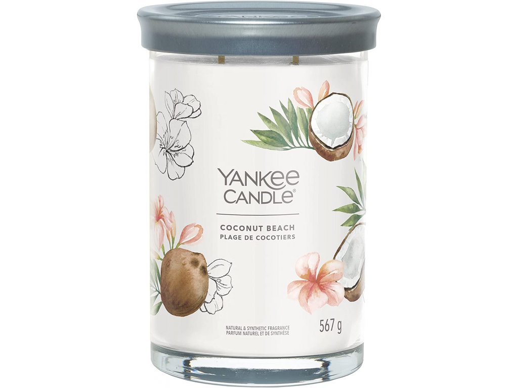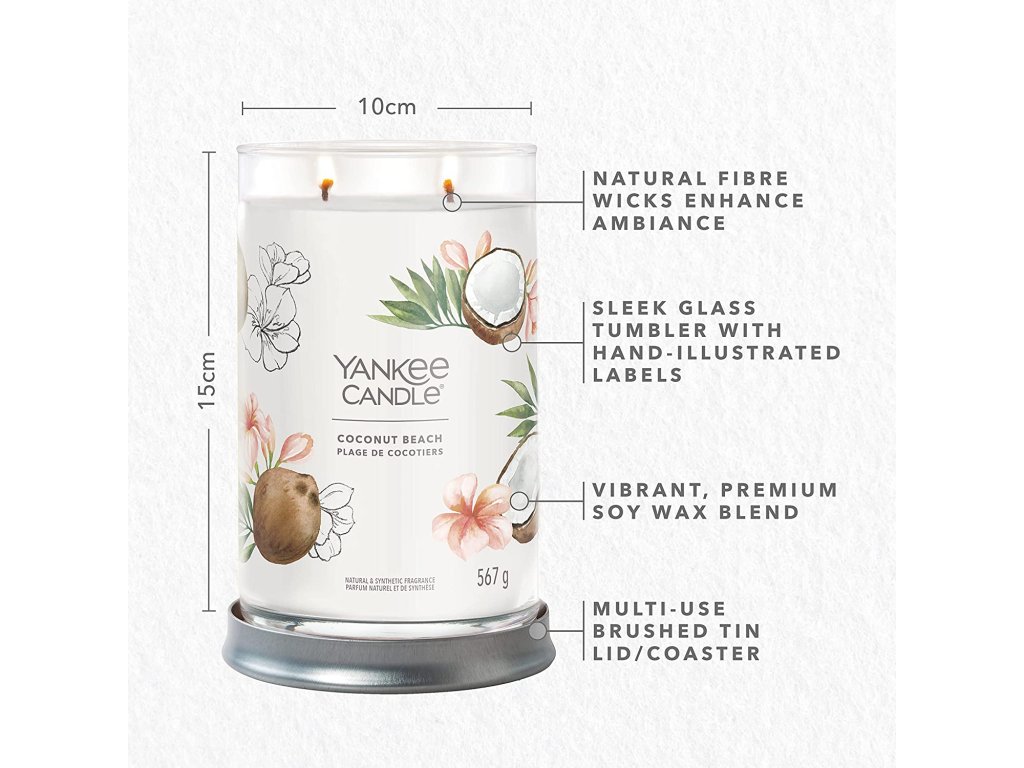 Svíčka Yankee Candle Signature Tumbler Coconut Beach vás přenese na tropický ostrov, kde můžete poznávat exotické ovoce, relaxovat na plážích a dopřávat si lahodné koktejly. Kokos a ananas jsou hvězdami této vůně, ale tahitská vanilka jí dodává nádech sladkosti, aby byla dokonalá stejně jako kokosová pláž. Nádherná vůně bude ve vašem domově přetrvávat ještě několik dní po zapálení této svíčky.
