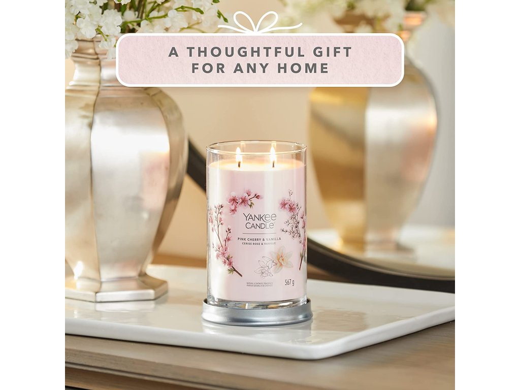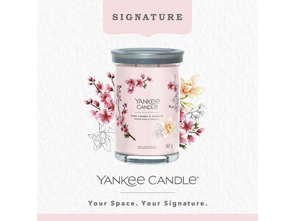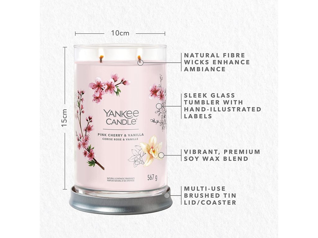 Pokud hledáte něco nového a vzrušujícího, nehledejte nic jiného než svíčku Yankee Candle Signature Tumbler Pink Cherry & Vanilla. Místnost naplní vůně malin a mandlí, zatímco nadýchané obláčky vanilkového krému vše spojí. S touto svíčkou se vám bude zdát o míse třešní, pokryté nadýchanými pastelově růžovými obláčky vanilkového krému.