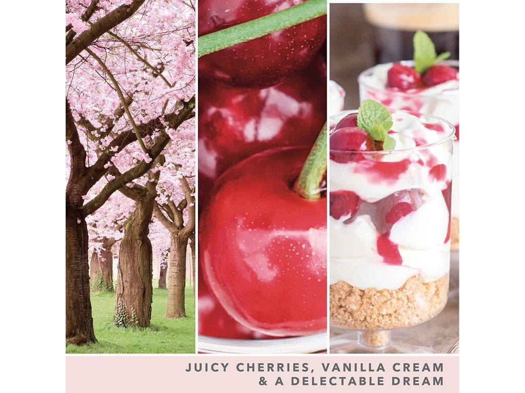 Dopřejte si svěží ovocnou vůni mísy třešní. Vůně malin a mandlí je pokrytá nadýchanými pastelově růžovými obláčky vanilkového krému.