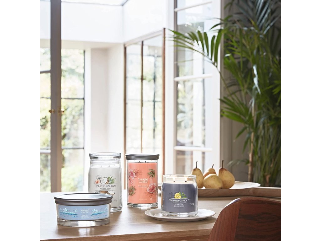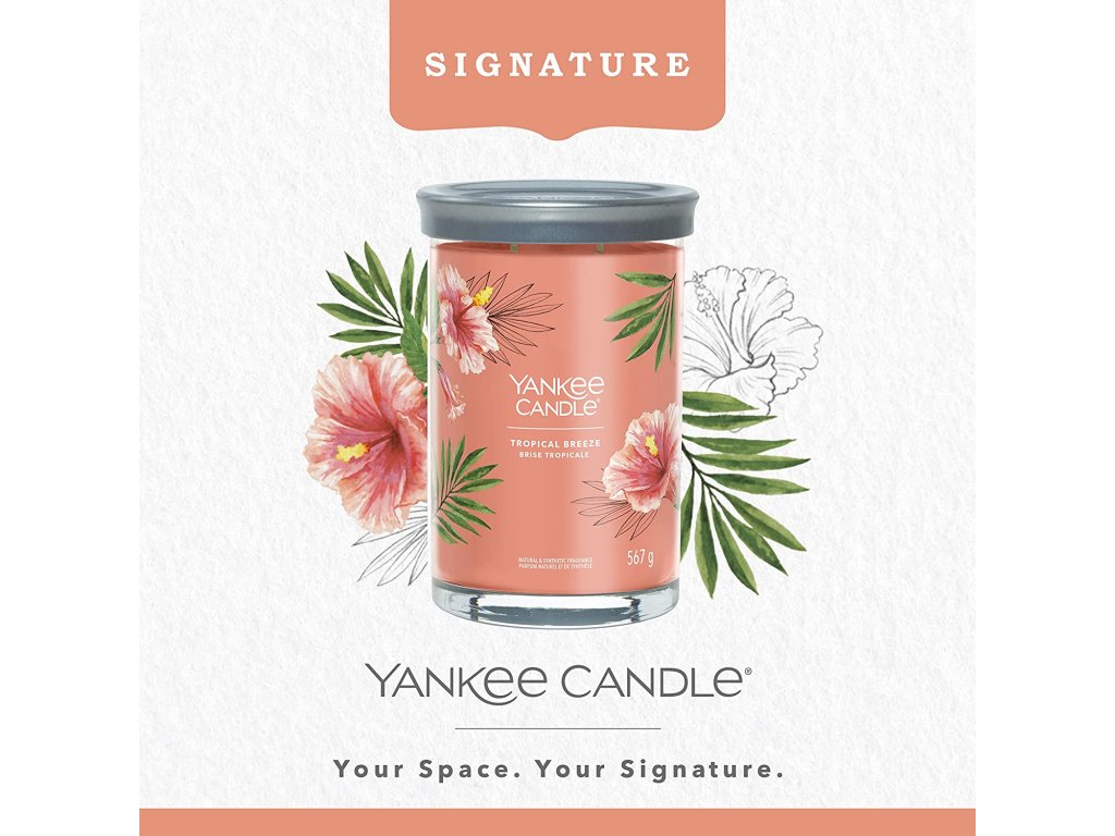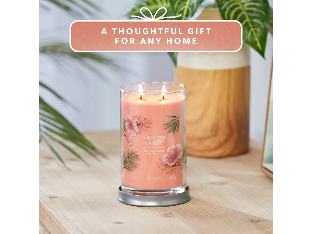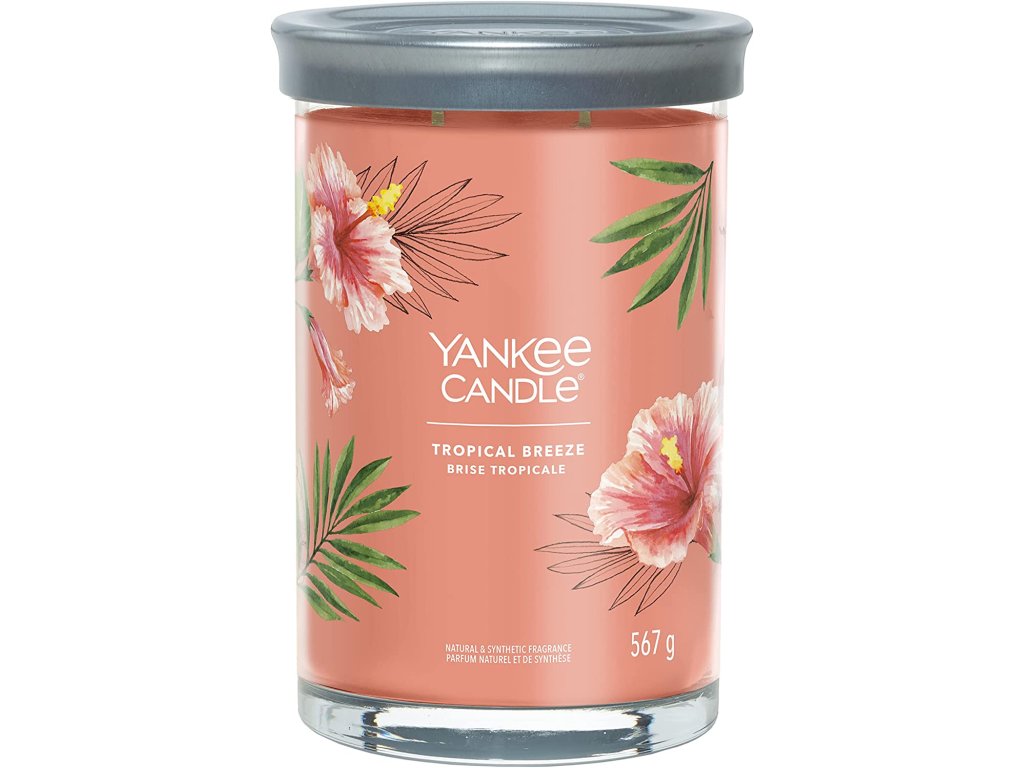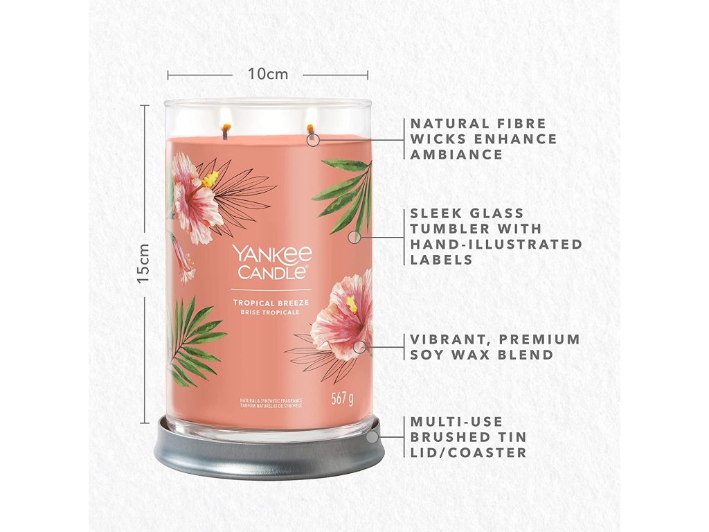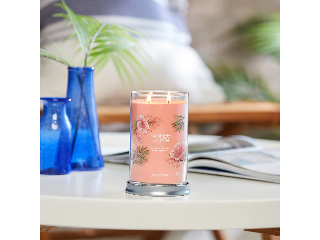 Se svíčkou Yankee Candle Signature TumblerTropical Breeze si budete připadat, jako byste seděli v baru, popíjeli svůj oblíbený drink, zatímco vám vítr čechrá vlasy a slunce zapadá za obzor. Stačí jediný závan a přenesete se do ráje.
