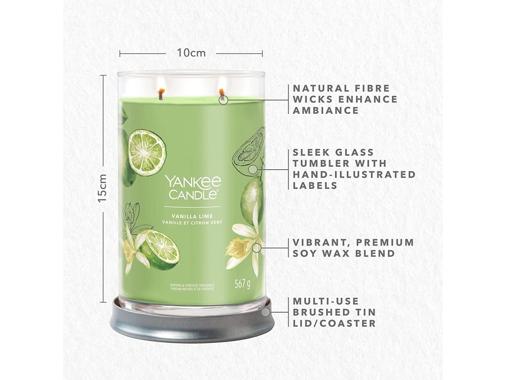Vůně Yankee Candle Signature Tumbler Vanilla Lime je zároveň sladká a krémová, ale i exotická a dobrodružná. Spojuje bohatost vanilky, sladkost třtinového cukru a svěžest limetky v jedné vůni. Je ideální pro ty, kteří si chtějí připomenout vzpomínky na zmrzlinové večírky z dětství, ale zároveň se chtějí cítit, jako by objevovali nové možnosti.
