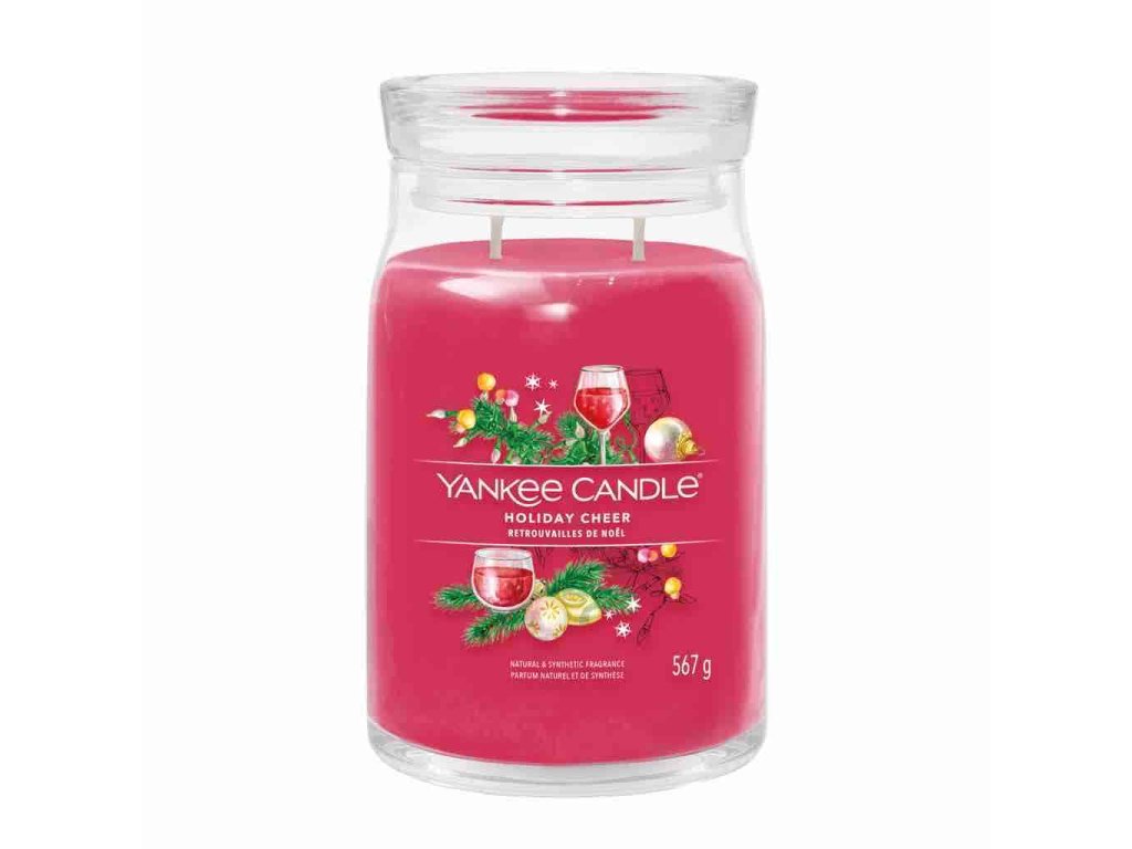 Velká vonná svíčka Yankee Candle s vůní Holiday Cheer v signature skleněné dóze s dvěma knoty a dobou hoření až 100 hodin.