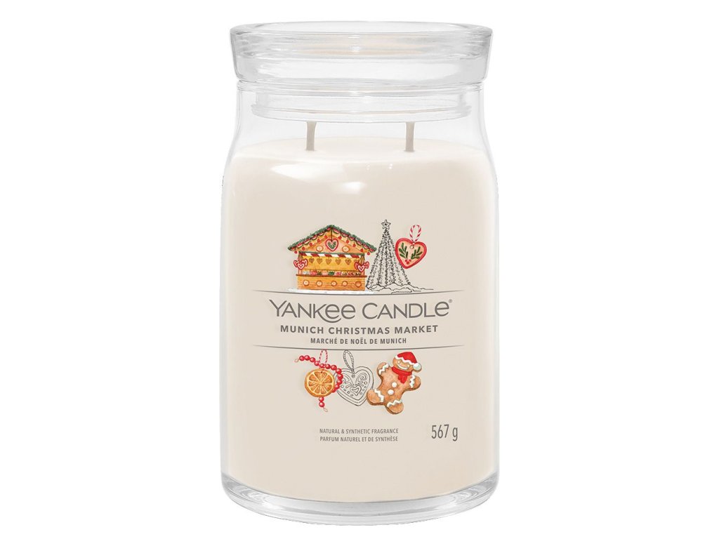 Velká vonná svíčka Yankee Candle s vůní Munich Christmas Market v signature skleněné dóze s dvěma knoty. Doba hoření optimalizovaná díky dvěma knotům.