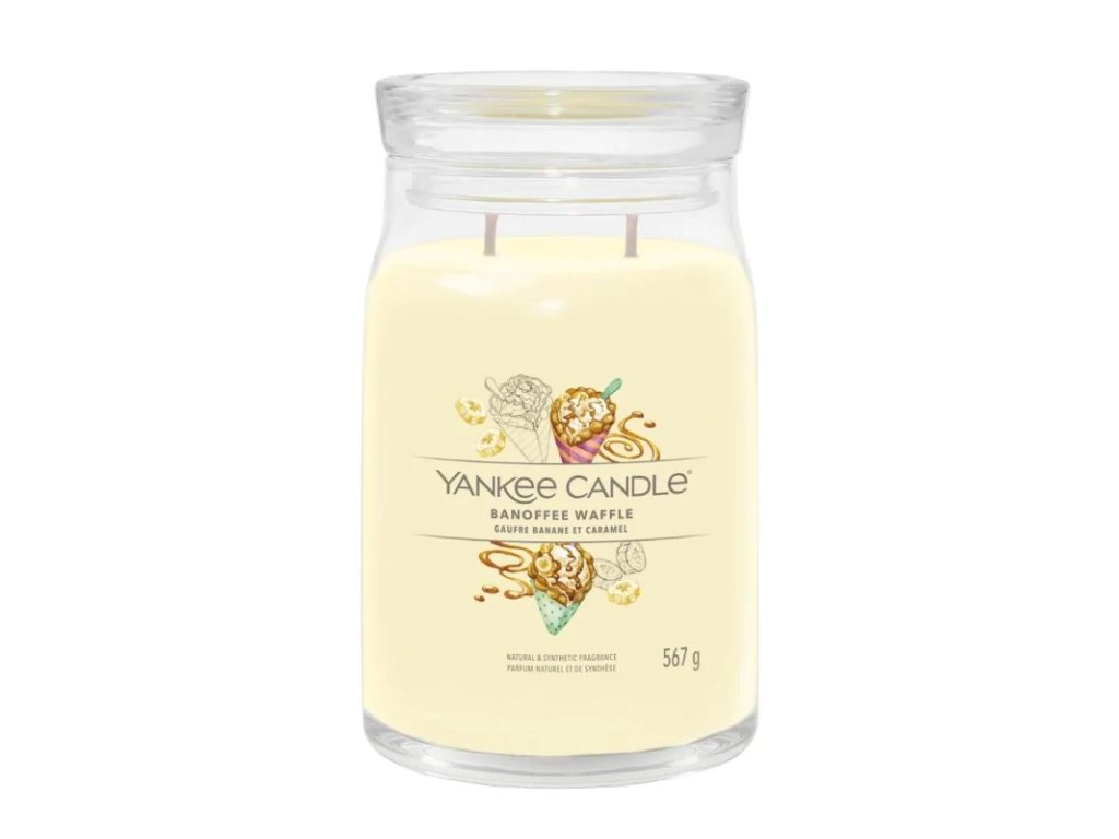 Yankee Candle Signature Banoffee Waffle 567g - Užijte si luxusní vůni křupavého vaflového kornoutu plného banánové zmrzliny, karamelové polevy a čokolády. Svíčka obsahuje hladkou směs se sójovým voskem a nejkvalitnější vonné přísady, vytvářející méně sazí.