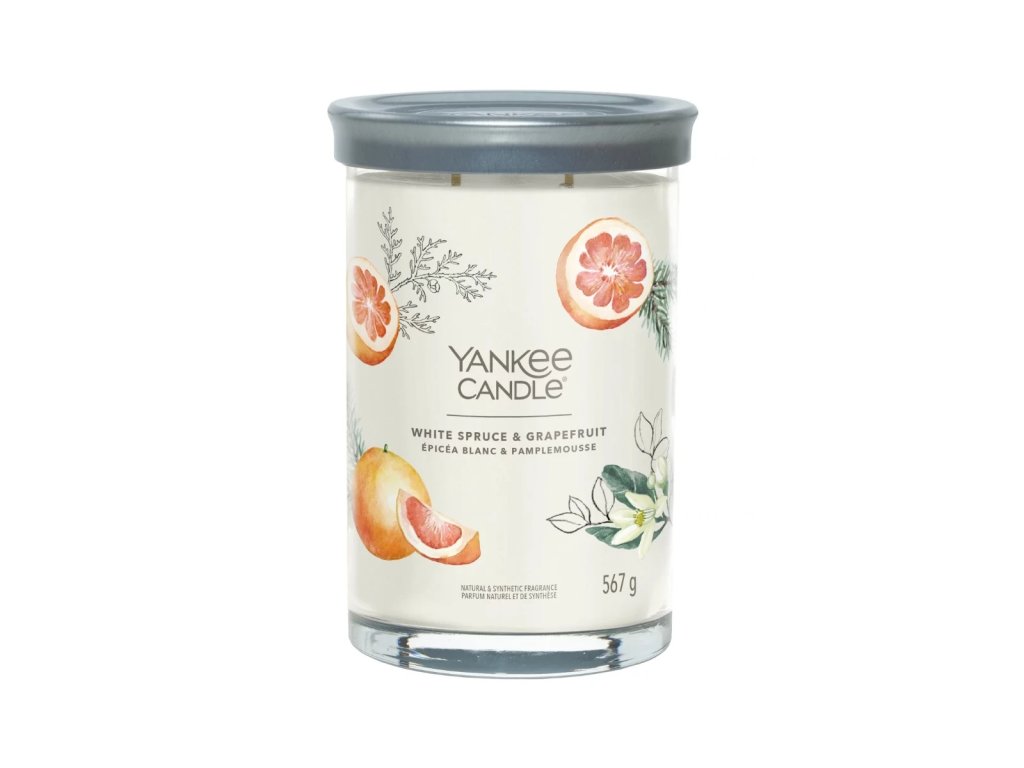 Yankee Candle Signature Tumbler White Spruce & Grapefruit 567g - Pokud hledáte svíčku, která nabídne dokonalý požitek z luxusní sladkosti, jste na správném místě. Tato Signature Tumbler svíčka je vyrobená z přírodních, ekologicky šetrných materiálů, které jsou bezpečné pro vaše zdraví i životní prostředí. S obsahem sójového vosku, svíčka nabízí čisté hoření a vytváří méně sazí. Hladká směs se sójovým voskem a dvěmi knoty vytvoří jezírko velmi rychle, takže ji lze pálit kratší dobu.